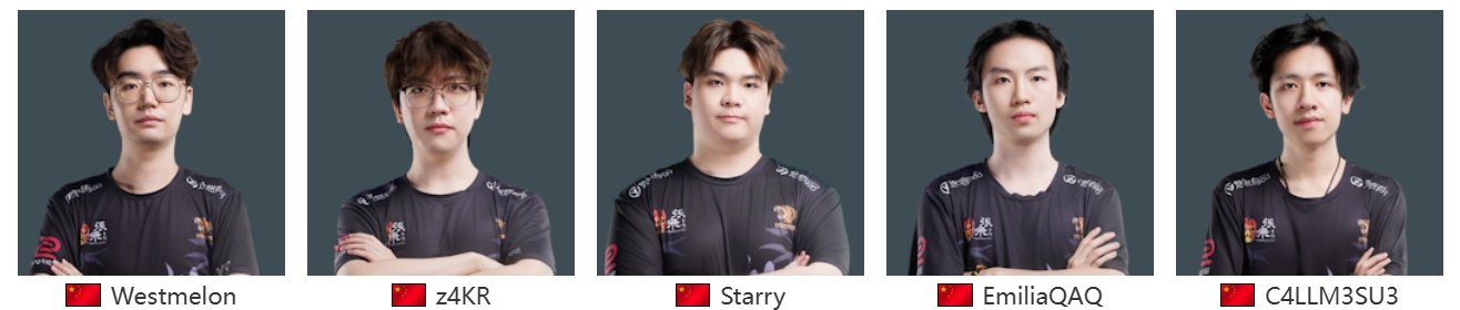中国豪门战队,拥有狙击手三叶z4KR、指挥西瓜Westmelon、冷面枪男Starry、国产直升机EmiliaQAQ和苏神C4LLM3SU3。他们在预选赛败者组众一穿六强势晋级,展现了他们的强大韧性,期待他们在家门口CAC打出不俗表现。