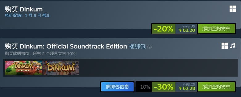游戏本体:8折优惠 捆绑包(含原声音轨):最高7折优惠 原声音轨包含43首承载《金垦小镇》独特氛围的背景音乐,不仅深受游戏粉丝喜爱,也适合喜爱平静、原声风格音乐的用户欣赏。