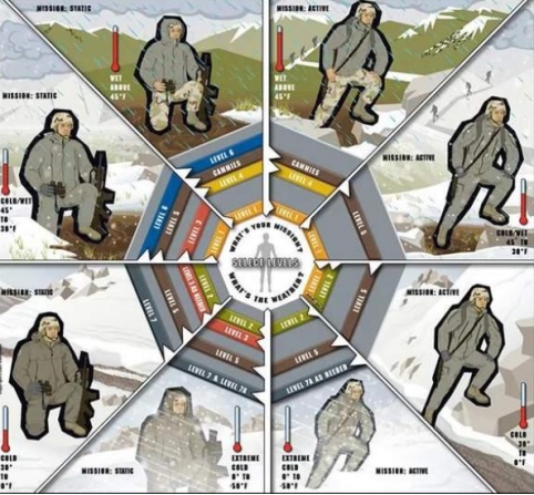 这套东西从贴身衣物到抓绒夹克到防风外套再到最外层的保暖套服,全都运用了各种黑科技,这使得士兵们不仅可以根据天气的变化来灵活定制穿着方案,还能保证在最低零下48°C的极端低温下的保暖干燥,最重要的是全套装备的重量也仅有七公斤,真正做到了极致的轻量化。