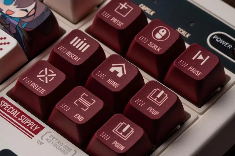 此次八位堂和鹰角网络不仅是一次简单的“形象联动”,而是将“游戏语言”翻译成“产品设计”的尝试。设计团队深入了解了双方粉丝的需求和期盼,知道许多朋友想要鹰角的角色形象和吉祥物们,能以实体纪念的形式留在自己的生活,同时也希望整个键盘在保持复古风的同时,还能体现属于鹰角的特色和吸引力。