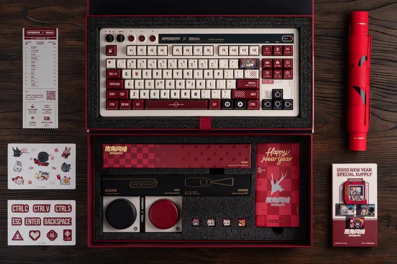 元旦过后,春节的氛围逐渐升温,2026年新春,八位堂携手鹰角网络,带来诚意满满的Retro87复古键盘新春联名周边套装。游戏是八位堂的起点,也是鹰角网络的起点。10多年来,八位堂深耕游戏周边领域,而鹰角网络则在数字娱乐领域持续探索,双方以“游戏基因”为共同原点,将八位堂经典复古款机械键盘与鹰角网络旗下作品的视觉标识完美融合,为玩家们送上诚挚的马年新春祝福。
