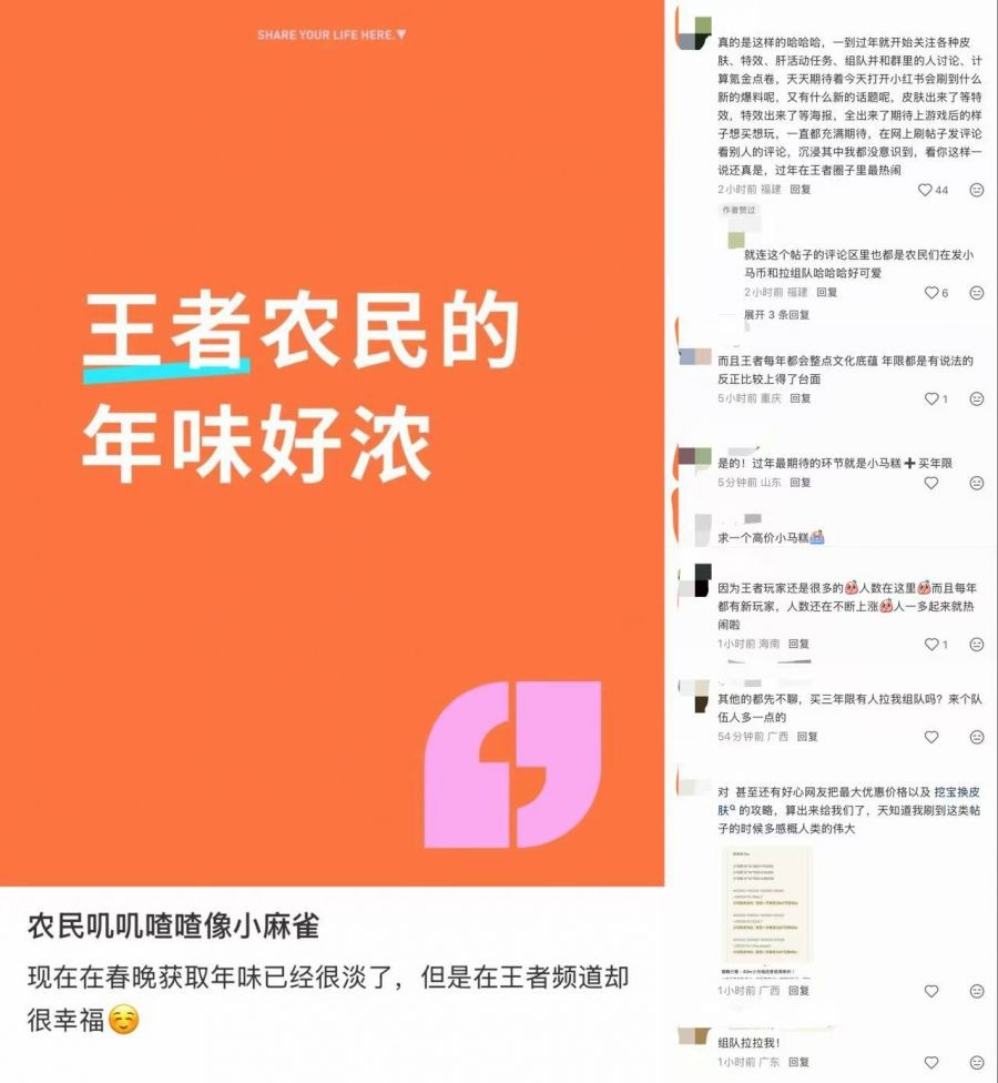 在社交平台上,王者玩家们讨论着各种游戏相关的话题。有网友发帖调侃“农民叽叽喳喳像小麻雀”,评论区里讨论年限皮肤、互赠小马糕、马年求组队、分享“农活”攻略……“各说各的,又有年味又和谐。”亿万玩家以各自的参与和表达,共同撑起了这份热气腾腾的数字年味。