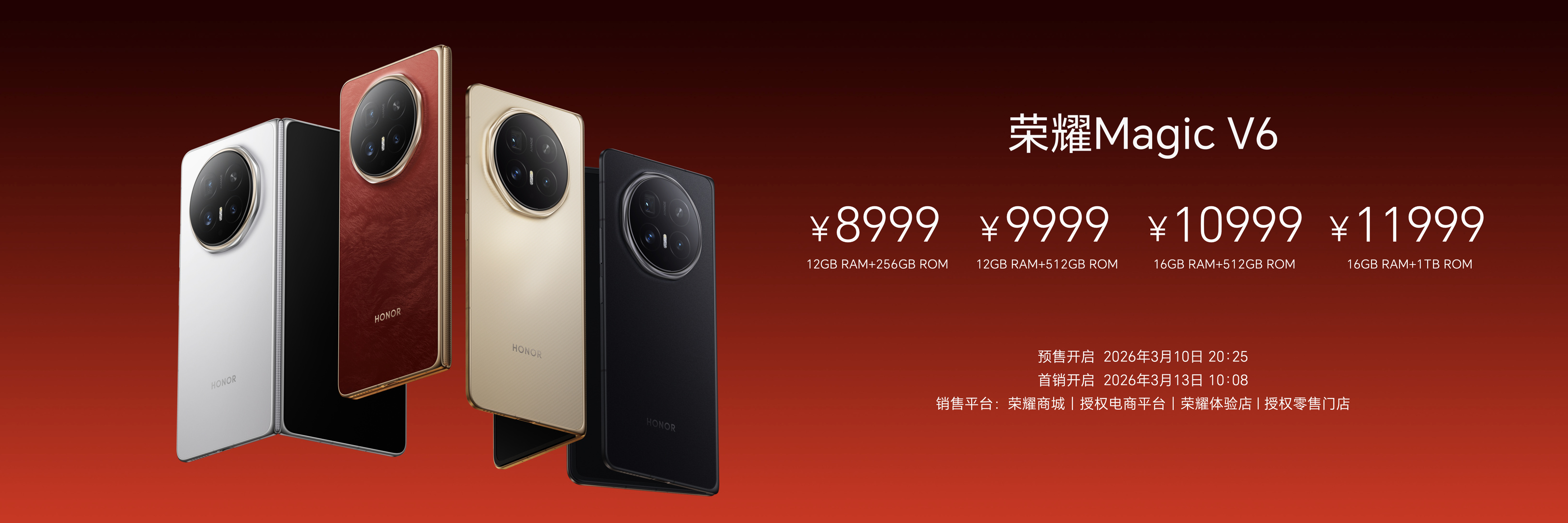 荣耀Magic V6共提供12GB+256GB、12GB+512GB、16GB+512GB、16GB+1TB四个版本,售价8999元起。新品已即刻开启预售,并将于3月13日上午10:08,在荣耀商城、各大授权电商平台、荣耀体验店、授权零售门店正式开售。