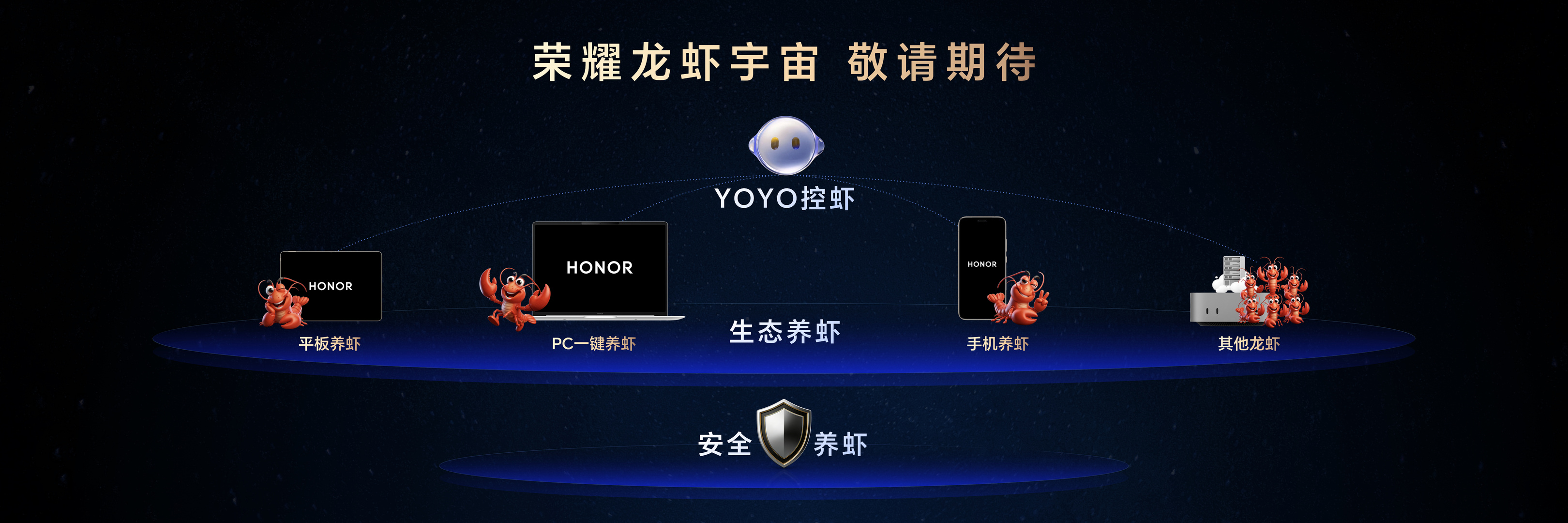 发布会上,还公布了生态级的荣耀龙虾宇宙,支持PC一键养虾、平板养虾,未来还能兼容其他生态设备的龙虾接入。用户可以通过YOYO在荣耀手机上直接和小龙虾交互,并安全地开放手机智能体供小龙虾调用,实现生态养虾、安全养虾和YOYO控虾三大能力。这些功能将于近期陆续开放内测。