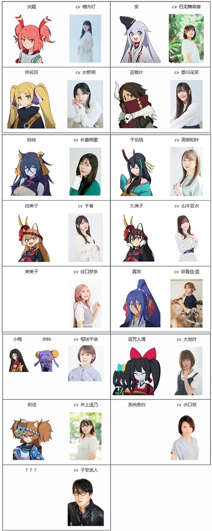 本次公布的声优阵容堪称豪华,主角炎姬由楠木灯献声,辅佐角色安的声优为石见舞菜香;水野朔、菱川花菜、长妻树里、高柳知叶等声优分别为栉名田、亚雅纱、玲玲、千乐院等重要角色配音,井上遥乃、大地叶、菲鲁兹・蓝等也参与了本作的配音工作,水口祭为游戏系统旁白配音,强大的声优阵容将为游戏的角色演绎与剧情表达增添更多色彩。