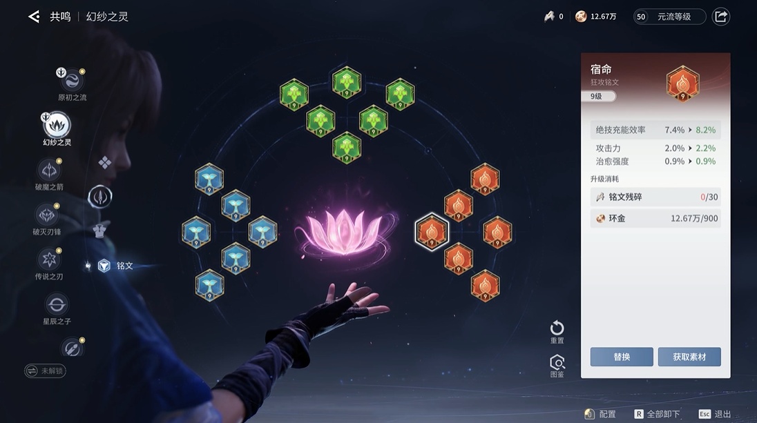 首先,养成体系架构给人最直观的感受是一目了然,铭文沿袭《王者荣耀》的经典框架且全共鸣通用,武器与装备均采用确定性的成长路径,从获取到搭配都尽可能降低理解门槛,减少了玩家的理解成本。