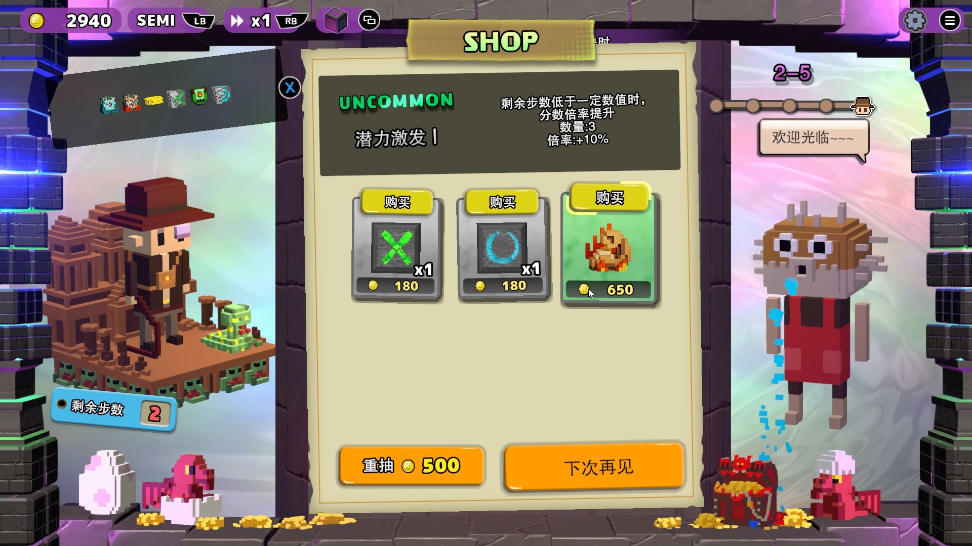 每一关结束后,玩家都会被拉入商店中购买各式卡牌。有些可以增加玩家获得分数的倍率,有些则需要通过牺牲玩家的步数来达成更好的增益效果,又或是提升炸弹、闪电等特殊道具方块的触发率。随着玩家不断推进关卡,所获得的卡片也会越来越高级,效果也会千变万化。