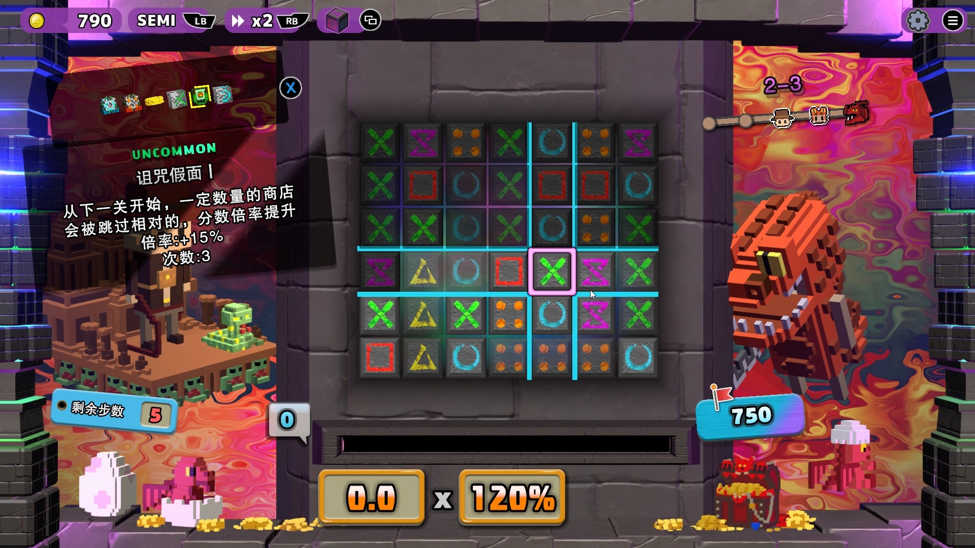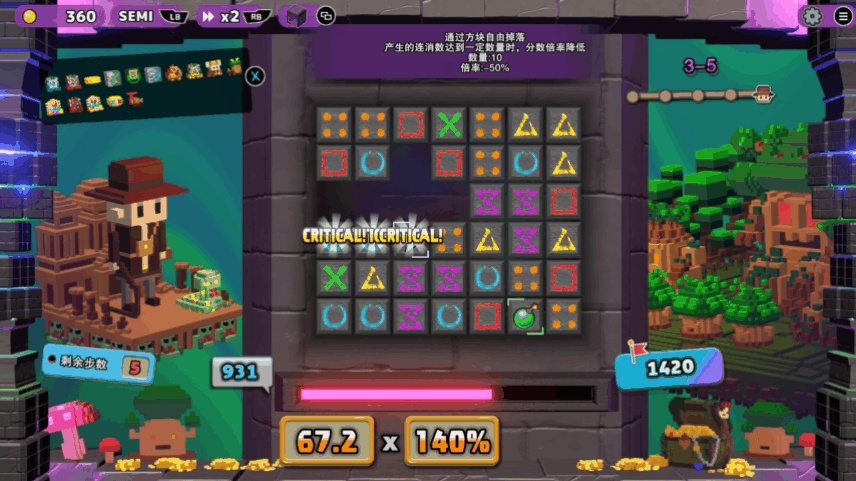 不过,过量的玩法堆砌很多时候会让新入坑的玩家手忙脚乱,而这便是《夺宝砖家》半自动模式的主要作用:若玩家想要专心享受卡牌构筑的乐趣,那么开启半自动模式便可以专注于肉鸽乐趣,而不用再费脑子去担心额外操作;但如果玩家更喜欢操作的乐趣,那玩家大可以关掉半自动专注于方块移动操作,从而享受卡牌构筑+三消操作的双重策略乐趣。