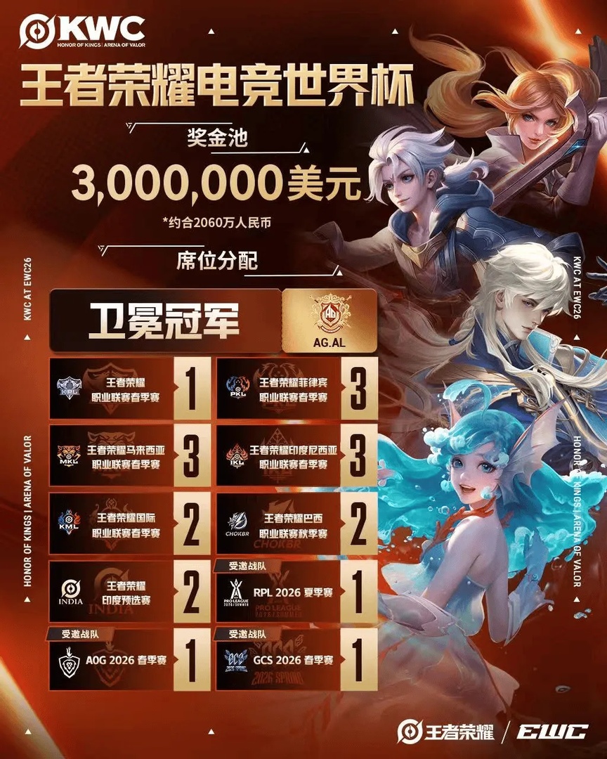 3月27日,王者荣耀官方正式公布2026王者荣耀电竞世界杯(KWC)赛事席位与赛制信息。作为王者荣耀全球电竞体系的顶级国际赛事,本届KWC赛事规模迎来全面升级,奖金池高达300万美元,参赛名额首次扩容至20支战队。比赛将汇聚来自全球的顶尖战队,包括HOK各赛区的精英队伍与受邀参赛的AOV战队,共同角逐全球竞技巅峰。AG.AL作为2025年 KWC冠军,将以卫冕冠军身份出征新一届赛事,再次向世界最高荣誉发起冲击。