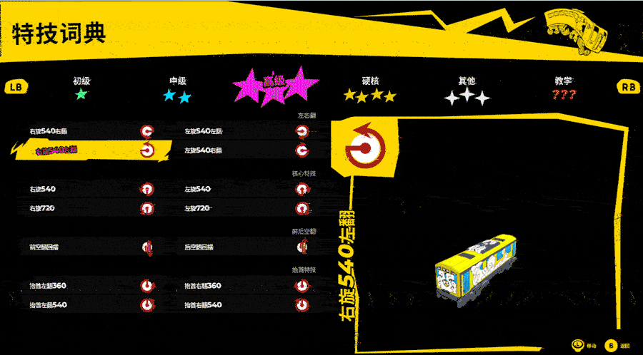 而这些动作还分成初级、中级、高级、硬核四个等级,越高级的特技动作也就越复杂、花哨。什么右旋360左翻回摆、抬首左翻回摆180,都只是家常便饭。