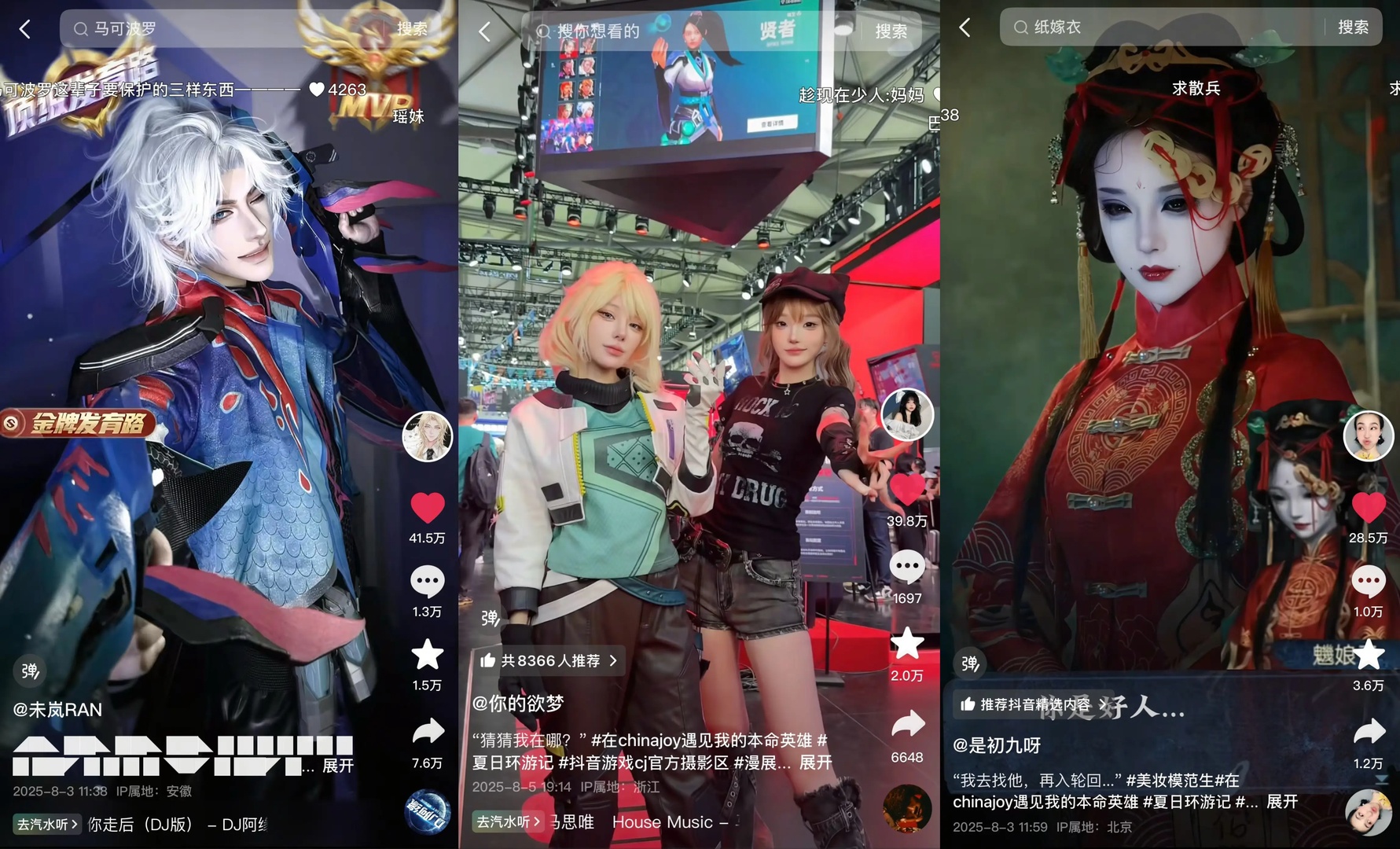今年的ChinaJoy,抖音游戏作为重要行业伙伴深度参与,并联合打造了首个“官方摄影区”。这不仅是抖音游戏「夏日环游记」内容场景的延伸,更是线上线下的融合枢纽。CJ现场围绕游戏梗文化“有款游戏越打越年轻”、“染上第五人格了”、“有的兄弟有的”等打造游戏主题场景。利用游戏视觉及梗点记忆,激发到场玩家自发打卡分享,在站内形成多个热点话题,持续吸引大批游戏头部作者和颜值达人前往官方摄影区拍摄视频,相关话题总播放量达7亿。优质爆款内容持续反哺平台内容生态,显著提升了抖音游戏的品牌影响力。