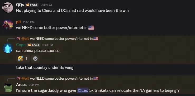 老外还抱团取暖,建立了一些外国玩家公会,其中的老资历“八方来财”公会兼具经验和实力。在渐渐适应了国服环境之后,其中的一些PVE头部玩家独立出来,联合其他散修的外国PVE高手,组成了顶尖老外PVE公会——Fast。顺带一提,这些PVE大能的“前世”很多都来自于Nota、Progress、Liquid等国外顶尖公会。