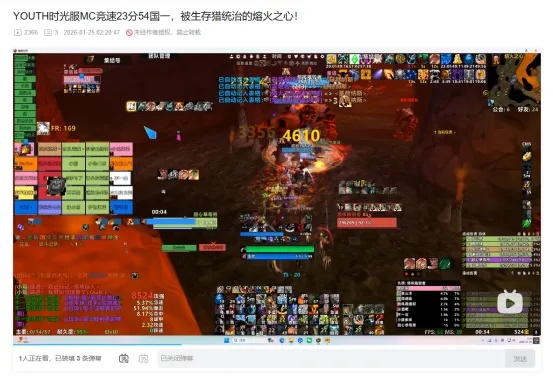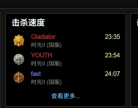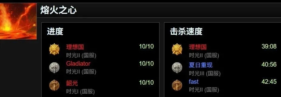 但“反超老外”不是结束,时光服的国服玩家们开始向着新的目标前进。此时他们超越的目标已经不是老外,而是自己的极限。在YOUTH开发出10猎人3DK的职业组合之后,直接将击杀速度干到了24分钟上下。各家国服公会之间也竞争激烈,竞速成绩的差距已经缩小到以秒计算。