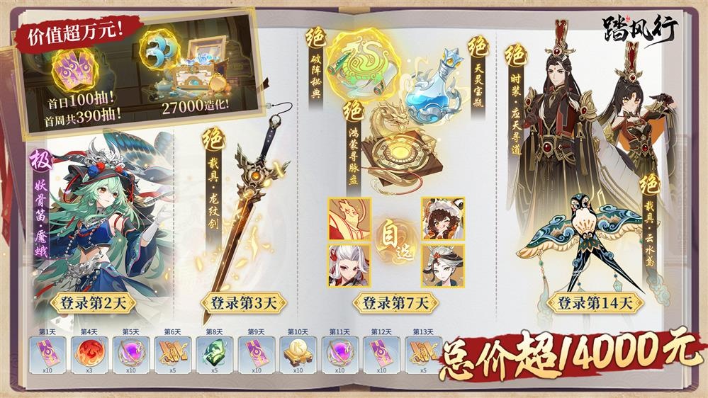 公测开服大放送,超值福利领到爽。只需动动小手,每日签到即领,连送14天,总价超万元,十连古宝、极品器灵、绝品载具、上古秘宝通通白嫖,让你成为仙界最靓的仔!