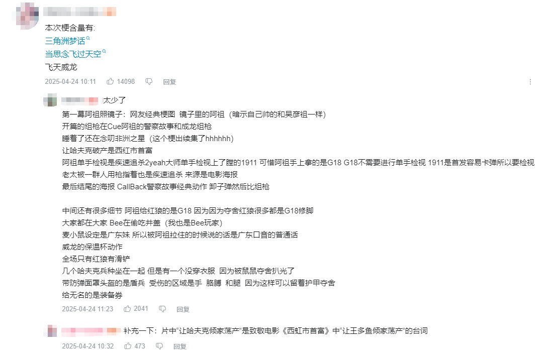 类似地,“猛攻”成为了三角洲玩家的口头禅,官方捕捉玩家热情,请来吴彦祖分享“猛攻”的哲学,打造属于玩家的“猛攻节”盛事。在宣传片中,惊人的“含梗量”再次让玩家惊叹不已,评论区对梗和彩蛋的总结常常需要多层回复才能完结。